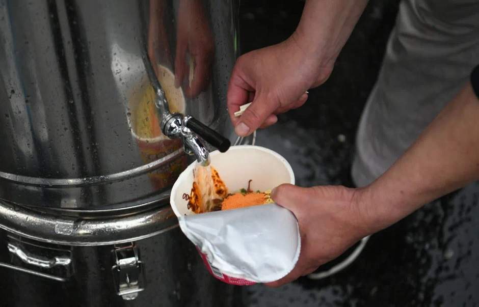 回到我们的“泡面摊”。300盒泡面,说多不多,分发也用了两个多小时。到了最后几盒泡面时,4大桶的热水都几乎用完了。于是剩下的几个滞留者,大家相互“匀了一下”,保证每个人的泡面碗里,都有一点热水……