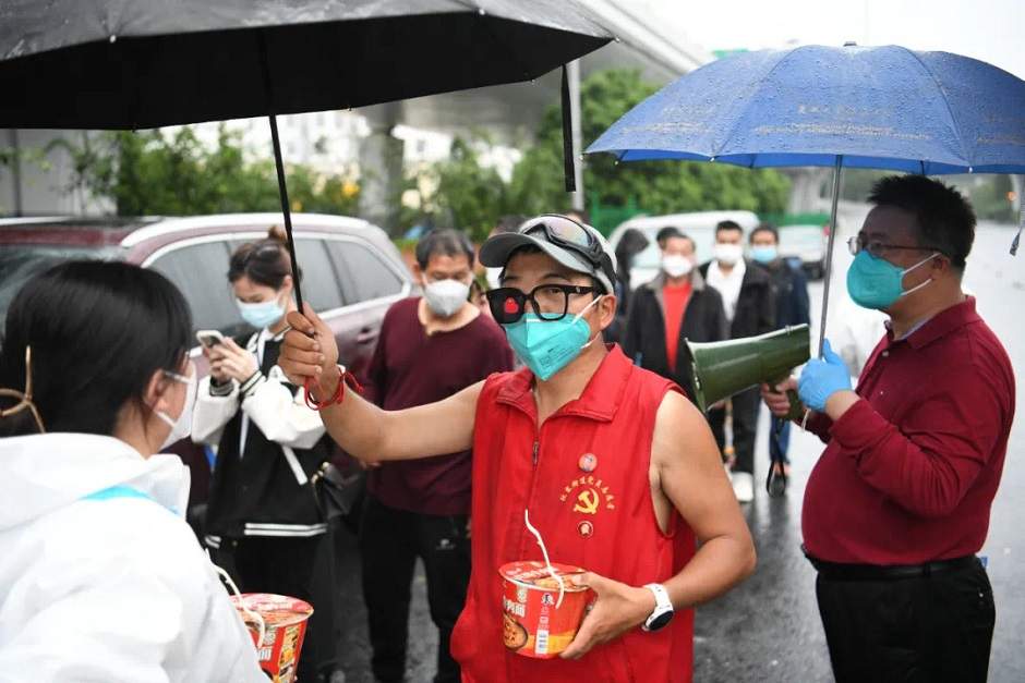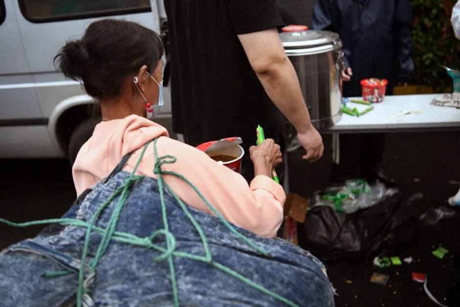 一个西安的小伙子,穿着红色志愿服,帮忙捡拾地上的垃圾。我们帮他泡上一碗面,他深深地喝了一口汤,说:“这是我在这里8天8夜,喝到的第一口热汤。之前,我都是用矿泉水泡面。”
