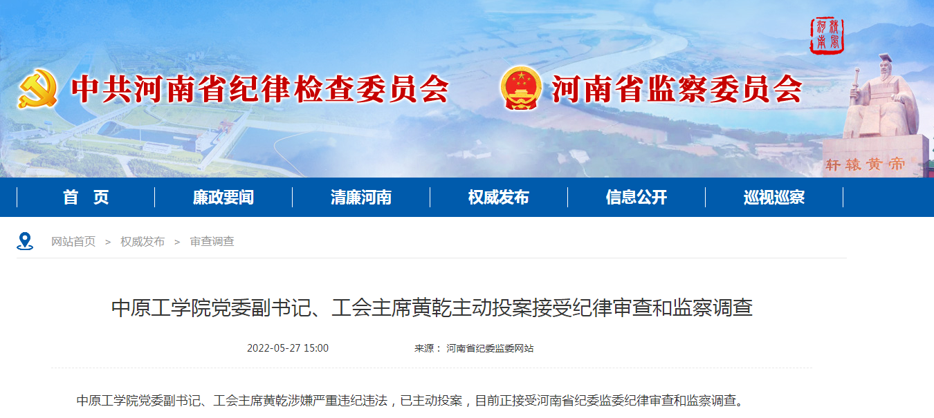 中原工学院党委副书记、工会主席黄乾涉嫌严重违纪违法,已主动投案,目前正接受河南省纪委监委纪律审查和监察调查。