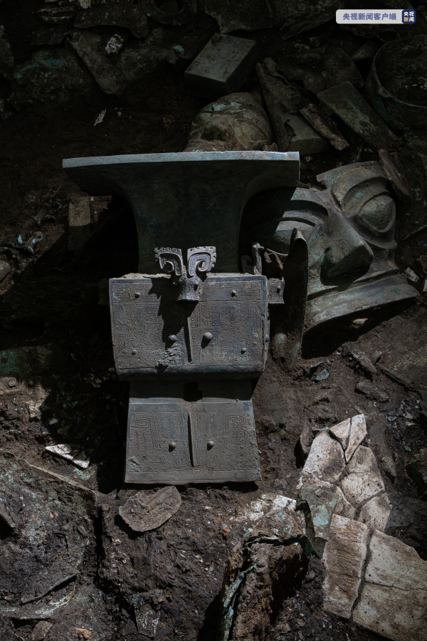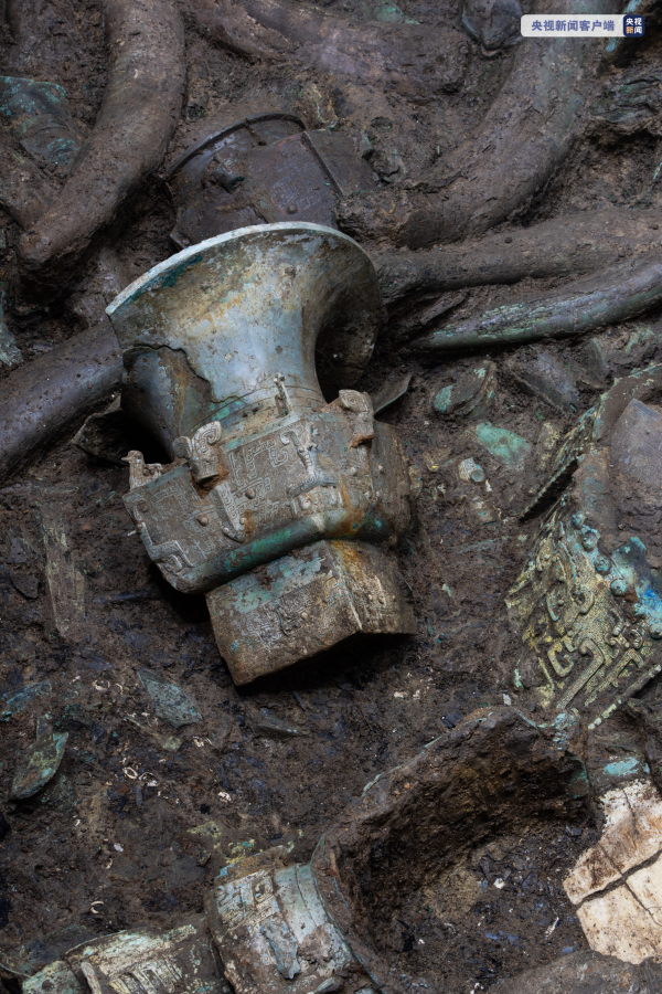 祭祀区内分布的商代遗存均与祭祀活动有关,包括1986年发掘的一号坑、二号坑以及本次新发现的6座坑,在8座坑的周边分布着矩形沟槽、小型圆形或矩形祭祀坑,以及南侧的灰沟、西北部的建筑。灰沟、建筑基础以及小型祭祀坑出土有金器、有领铜瑗、跪坐石虎、跪坐石人、石琮、石璧、玉凿、绿松石和象牙等珍贵文物。在现有祭祀区表面堆积(第⑤层)之下还分布着埋藏整根象牙或相对完整玉石器的祭祀坑,表明该祭祀区延续使用时间较长,目前发掘的6座新坑为代表的祭祀遗存为该祭祀区偏晚阶段遗存。