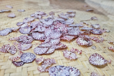 朱改莲(右)指导年轻人切药,被切后的槟榔片如纸薄