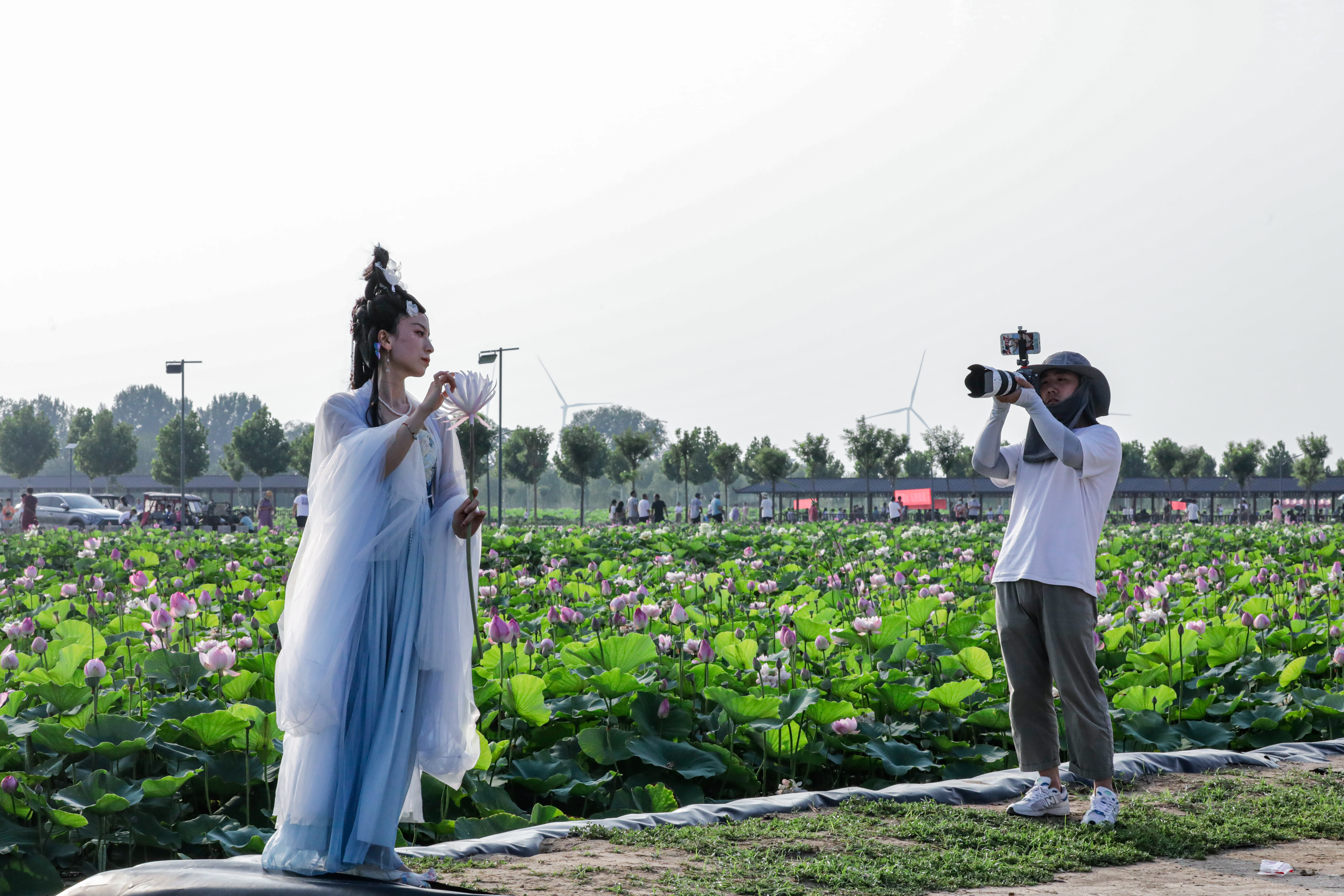 7月6日,武陟县千亩荷塘正式免费向游人开放,美景也吸引了众多市民前来参观。在荷塘中央的吊桥上,一位位撑着油纸伞,穿着新中式旗袍的阿姨们正在拍照游玩,好不自在。