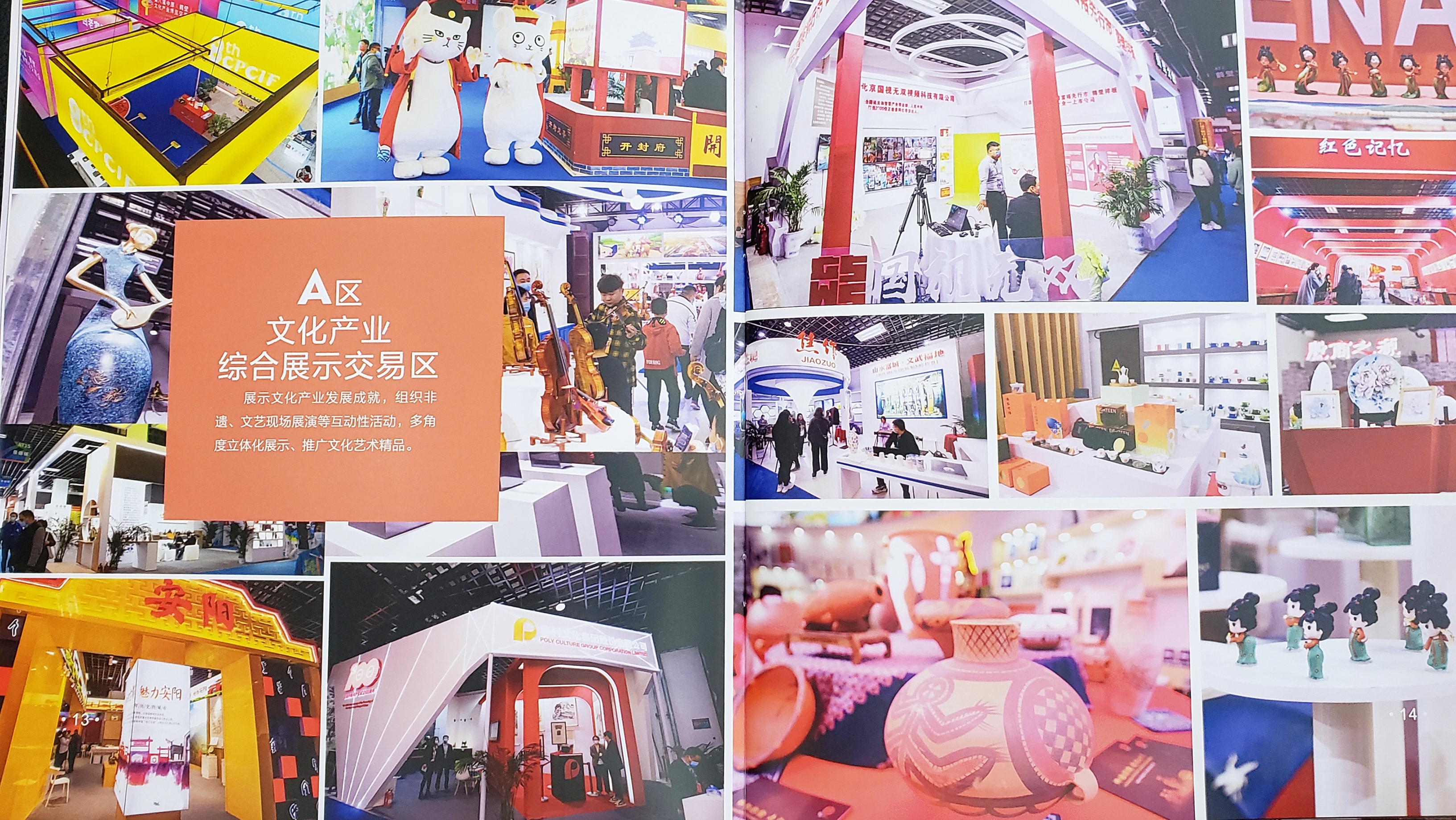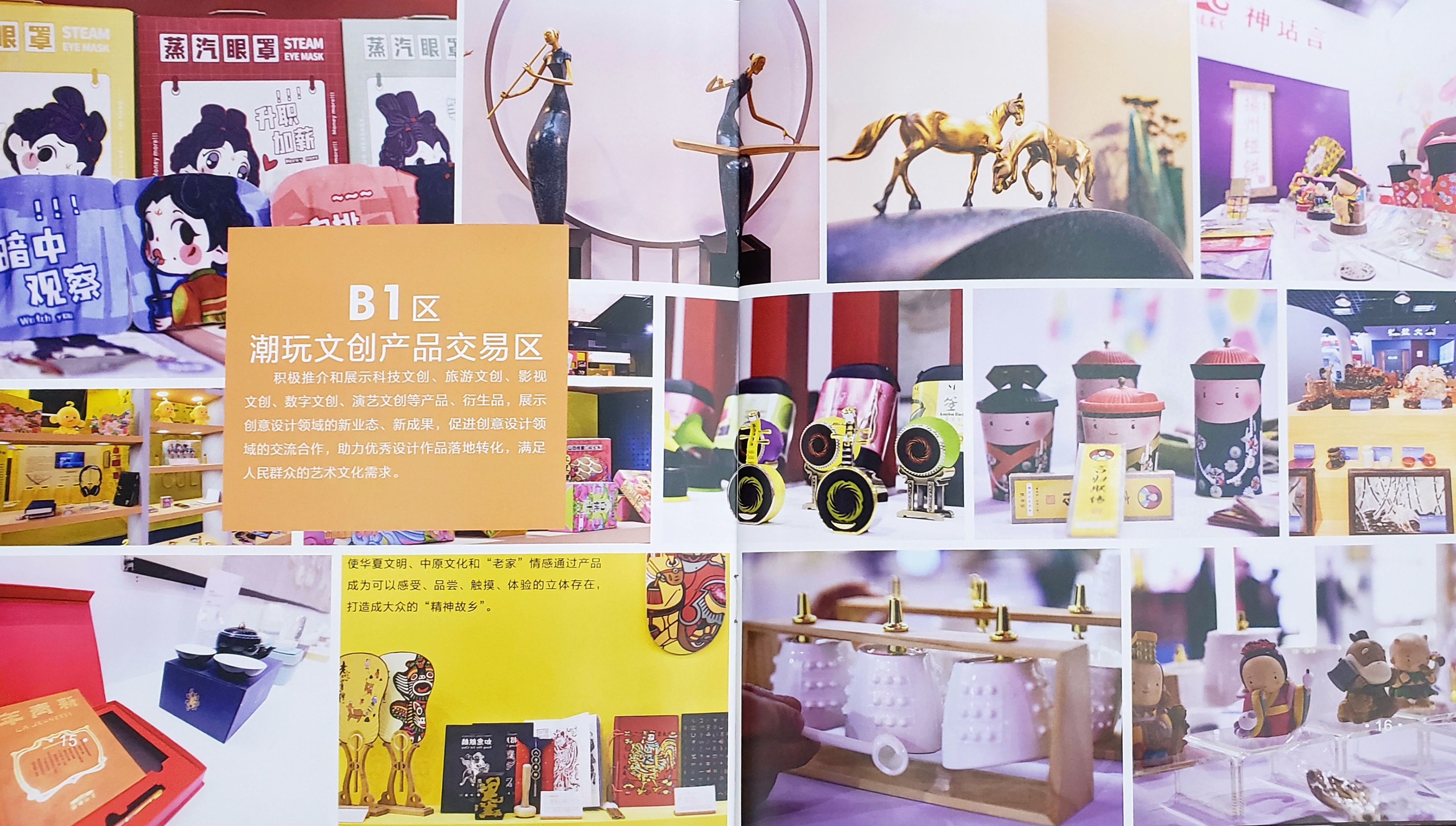 1.文化产业综合展示交易区。展示省内外文化产业发展成就,展销全国各地具有代表性的工艺精品、民间技艺、非物质文化遗产等特色内容;组织非遗、文艺现场展演等互动性活动,多角度立体化展示、推广中原文化艺术精品,促成文产项目对接落地。主要由中原文化产业成就展示交易区、全国文化名企强企展示交易区、国有文物商店文物艺术品交流区及“云上文博”直播区等组成。