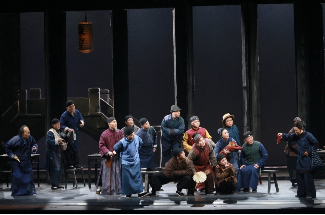 鲁镇,是故事开始的地方,于伟大的文学巨匠鲁迅先生来说是,于他笔下的小人物祥林嫂、孔乙己、狂人、阿Q等也是,它是鲁迅对故乡环境的艺术概括,它在曲剧《鲁镇》中被赋予了强烈的象征意义,地点不固定,可以在江南,也可以在中原,甚至在旧中国的任何一个角落,它是鲁迅笔下的“铁屋子”,是旧中国的缩影,是半殖民地半封建社会典型的病态环境——愚昧落后,封闭保守,游走其间的一个个沉默的灵魂都是看客,他们自我麻醉、自私冷漠、自欺欺人,自轻自贱,甚至自相残杀,“大小无数的人肉的筵宴,即从有文明以来一直排到现在,人们就在这会场中吃人,被吃,以凶人的愚妄的欢呼,将悲惨的弱者的呼号遮掩,更不消说女人和小儿”(引自《坟·灯下漫笔》)。