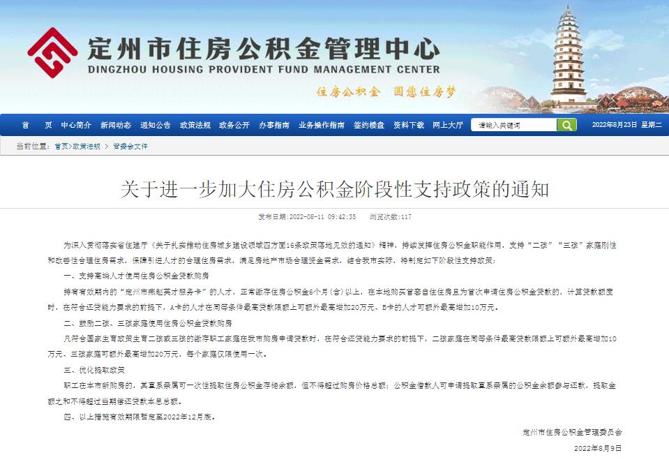 中新网8月23日电 定州市住房公积金管理委员会近日发布《关于进一步加大住房公积金阶段性支持政策的通知》,其中提出,鼓励二孩、三孩家庭使用住房公积金贷款购房。凡符合国家生育政策生育二孩或三孩的缴存职工家庭在该市购房申请贷款时,在符合还贷能力要求的前提下,二孩家庭在同等条件最高贷款限额上可额外最高增加10万元、三孩家庭可额外最高增加20万元,每个家庭仅限使用一次。措施有效期限暂定至2022年12月底。(中新财经)