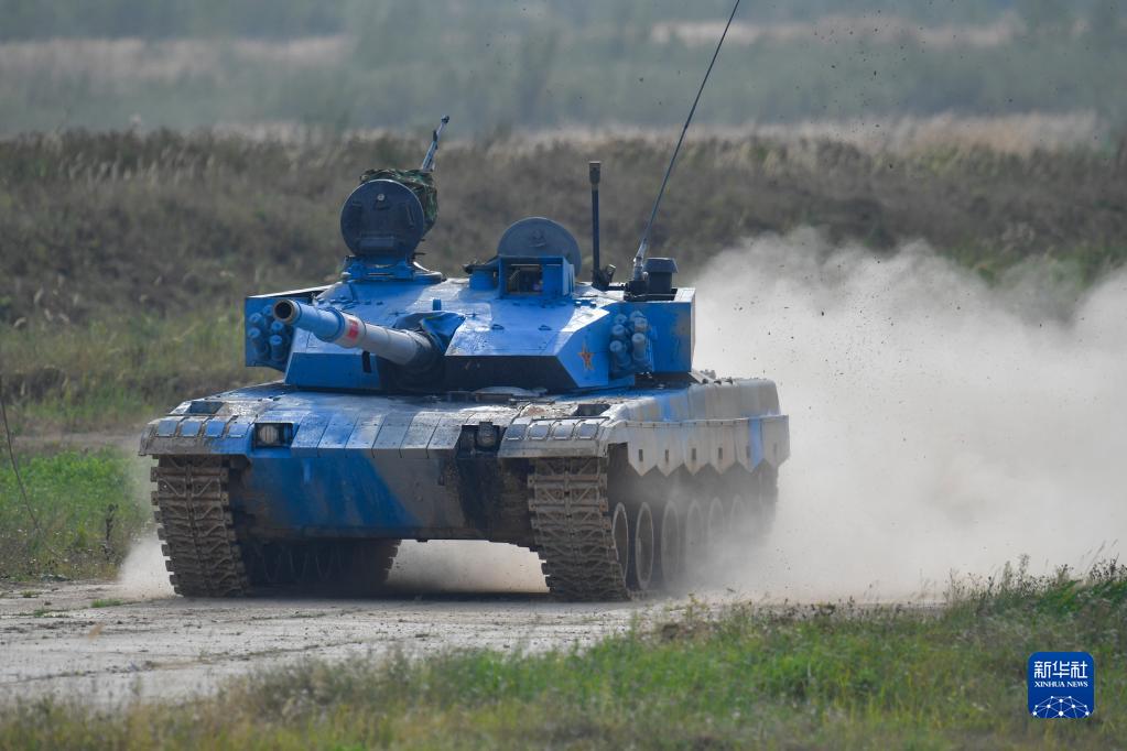 8月27日,在俄罗斯莫斯科州阿拉比诺靶场,中国参赛队96B坦克在比赛中。新华社发(亚历山大摄)