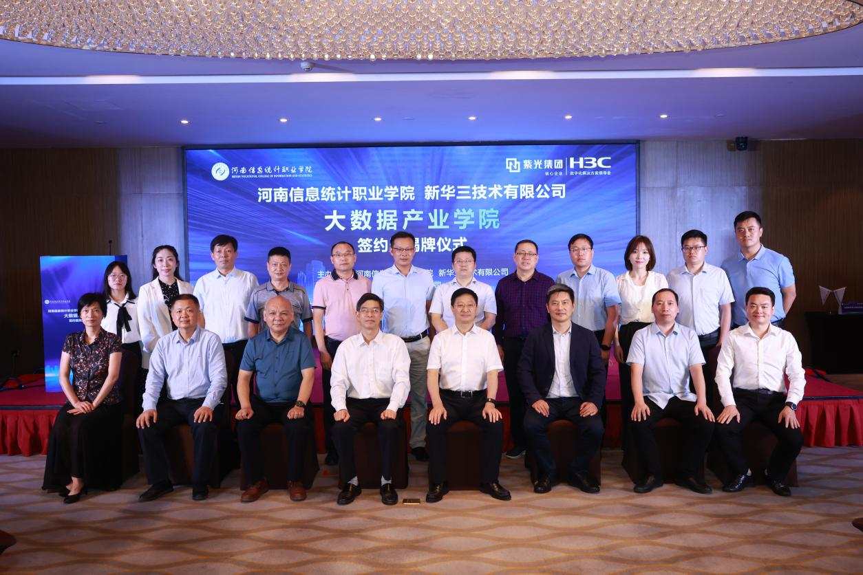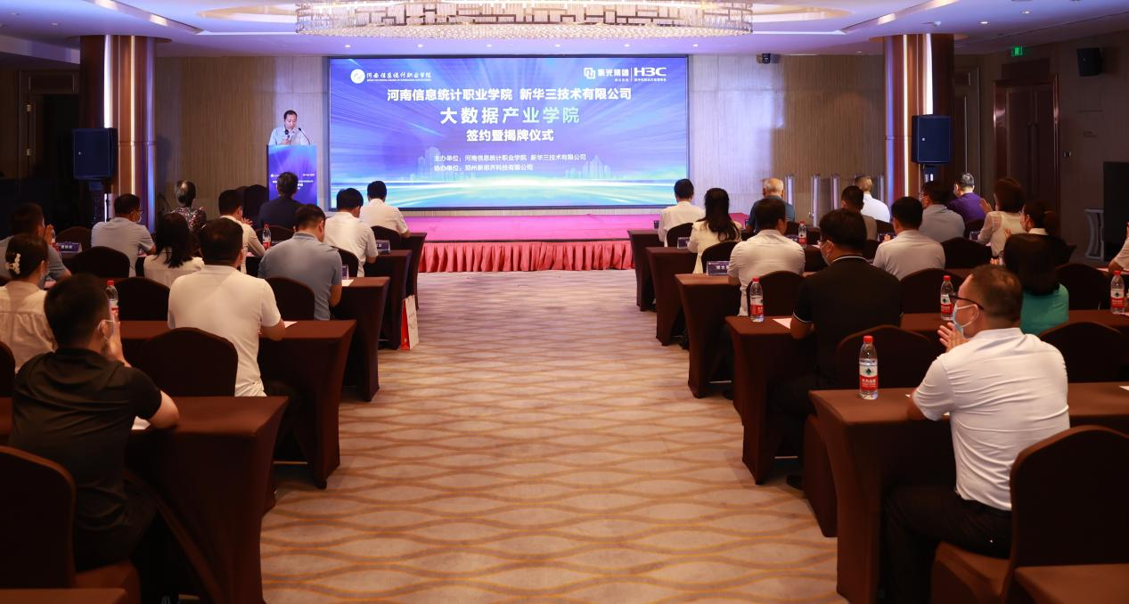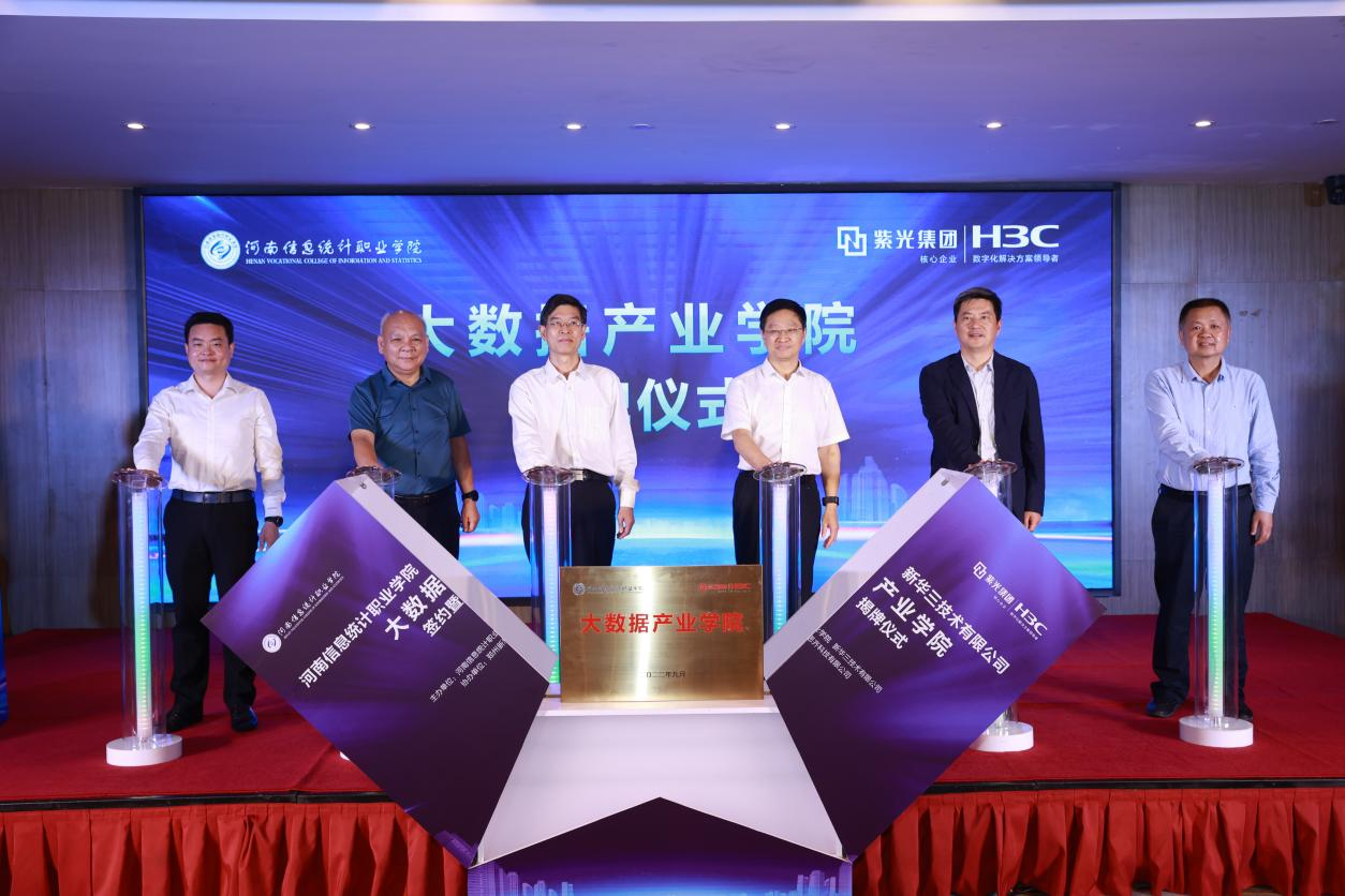 在与会人员见证下,宗方、汪卫国分别代表河南信息统计职业学院和新华三技术有限公司签署校企战略合作协议。秦剑臣、郝小会、汤徽、汪卫国、刘录林、梁景予共同为“大数据产业学院”揭牌。