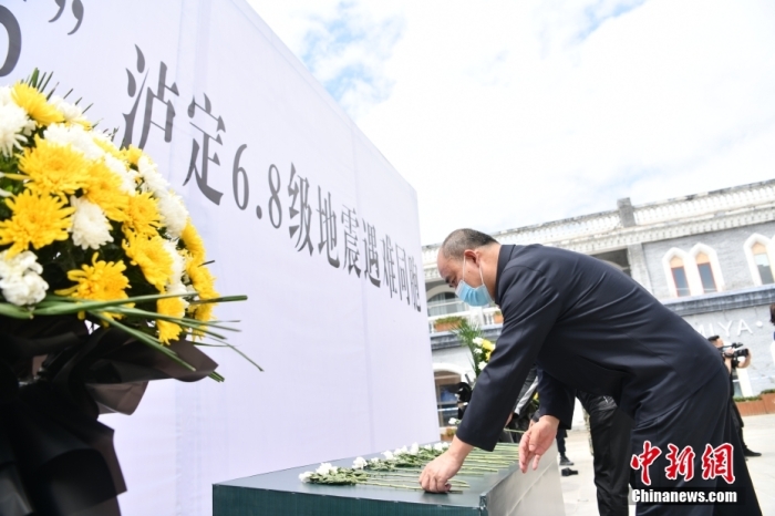 磨西镇哀悼活动现场,“深切哀悼‘9·5’泸定6.8级地震遇难同胞”的横幅庄重肃穆。12时52分,地震发生的时间,防空警报在磨西镇上空鸣响,现场人员向地震遇难同胞默哀3分钟,并敬献鲜花。