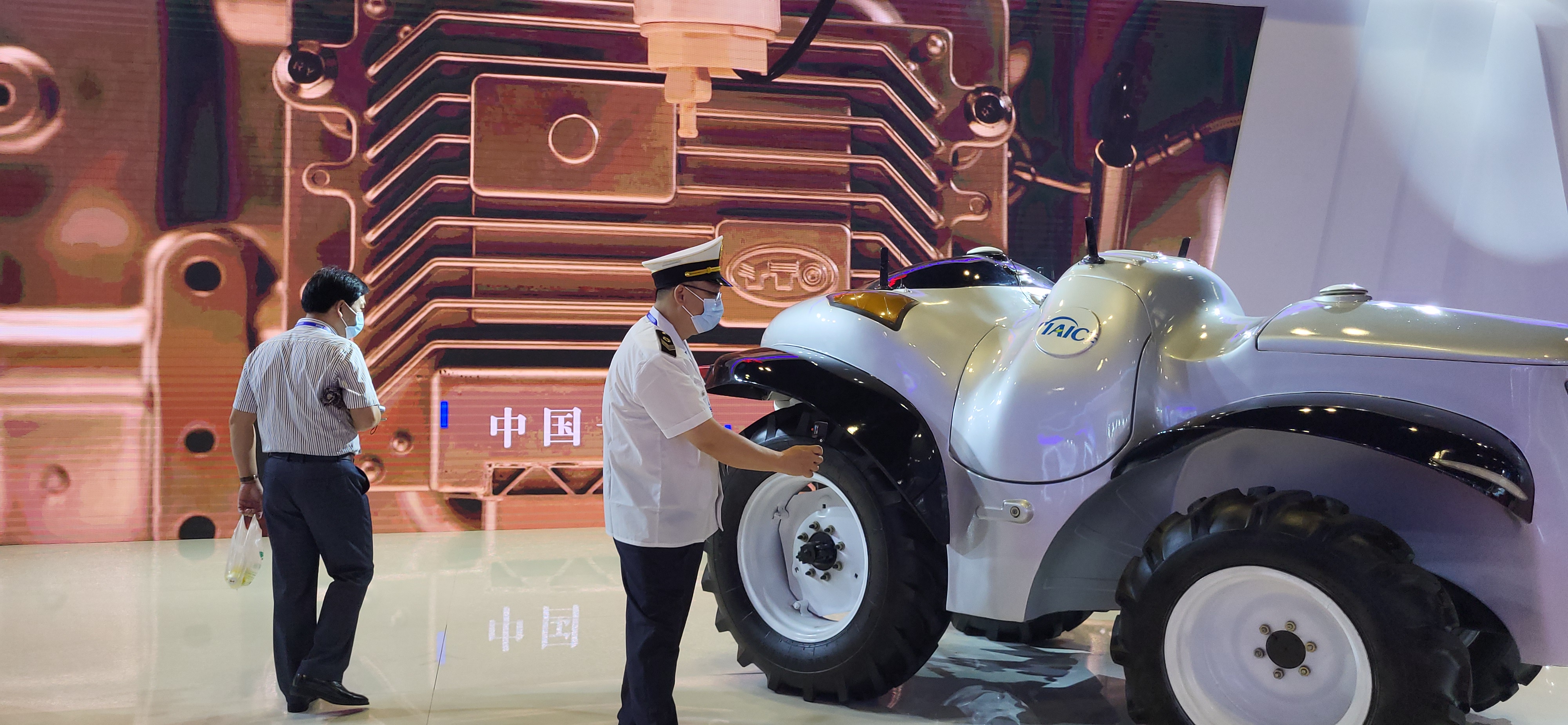在东博会现场,有不少观众对着一辆酷似吉普车的拖拉机按下快门键。记者也在现场见到了这辆由中国一拖牵头研制的5G+氢燃料电动无人驾驶拖拉机实车,“它是通过无人驾驶、远程操控等形式,实时感知整车运行状态及周边作业环境,满足犁耕、旋耕、播种等作业需要,可有效提升农机作业的可靠性和工作效率。”国家农机装备创新中心的工程师杜鹏飞告诉记者,“目前,无人驾驶在汽车领域已经形成了相对成熟的发展路径,但在农机领域还处在探索阶段。我们带着这辆农耕机来到东博会,也是为了展示我们国家在农机制造领域的前沿技术。”无人驾驶拖拉机是氢能源在拖拉机领域的一次突破性尝试,它顺应了农机环保发展的趋势,旨在进行氢能源在农机领域的开发。杜鹏飞也表示他们会继续在研发过程中引领行业发展,助力我国农机工业的跨越发展。