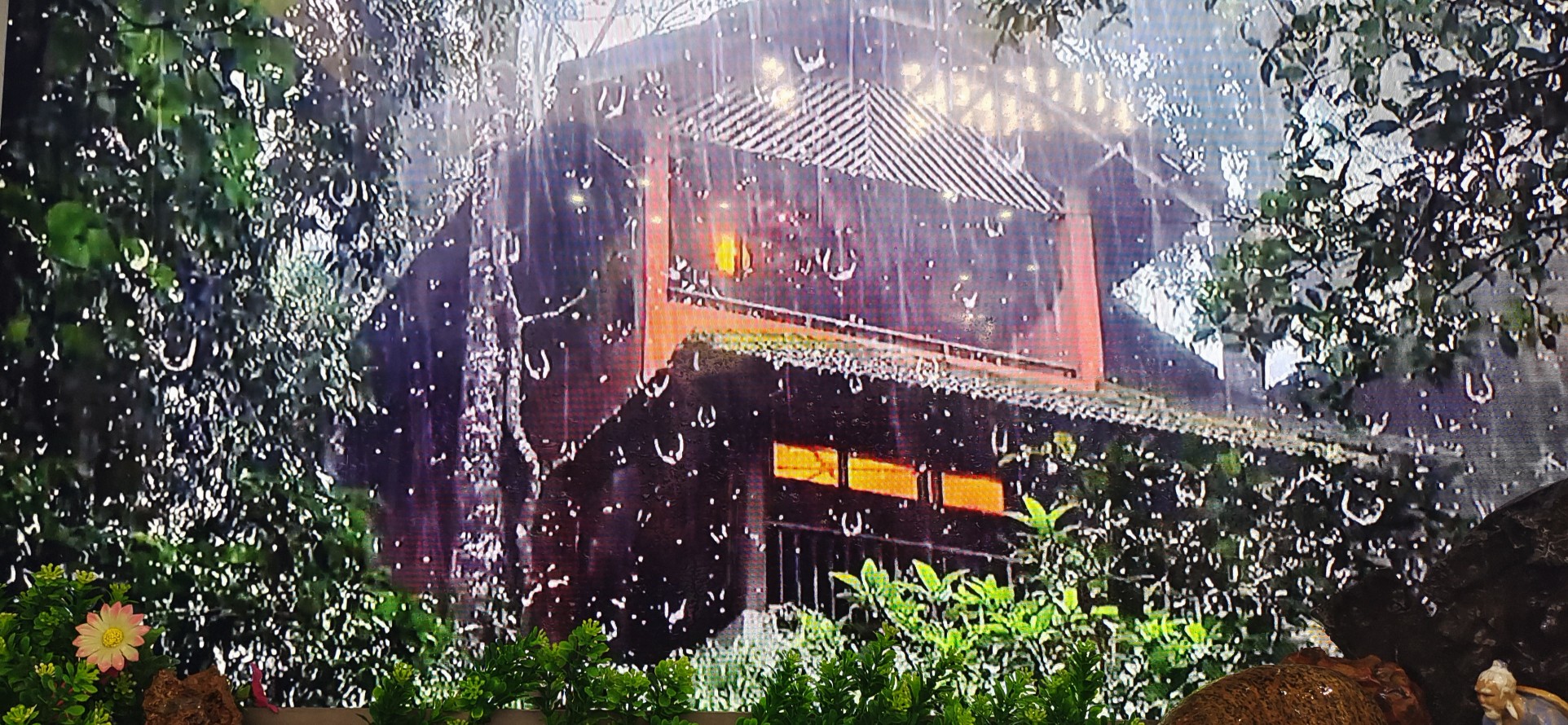 两扇玻璃窗打开,古色阁楼,小溪潺潺,吟诗作赋,窗户上时而淋着细雨,两侧凉风习习;过一会背景切换,大雪纷飞,北风呼啸。