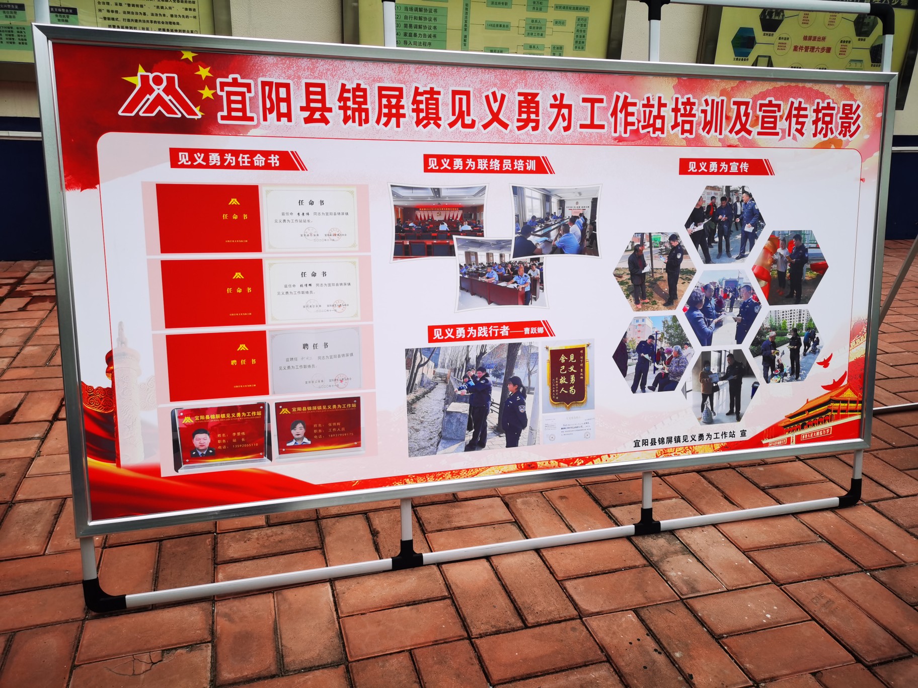 广场以大桥为轴线、南北对称,东西两侧各安装了八块高2.5米、宽1.5米的红底大型宣传牌。分别展示了发生在宜阳当地11起英模和县域外3起英模的壮阔事迹;以及见义勇为相关政策解读和以图文并茂、浅显易懂的形式宣传了见义勇为行为。