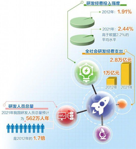 十年来,我国科技投入力度空前。全社会研发经费支出从2012年的1万亿元增长到2021年的2.8万亿元,居世界第二位。研发经费投入强度也高居发展中国家之首,从2012年的1.91%提高到2021年的2.44%,高于欧盟2.2%的平均水平,彰显了中国走高质量发展之路的决心和信心。