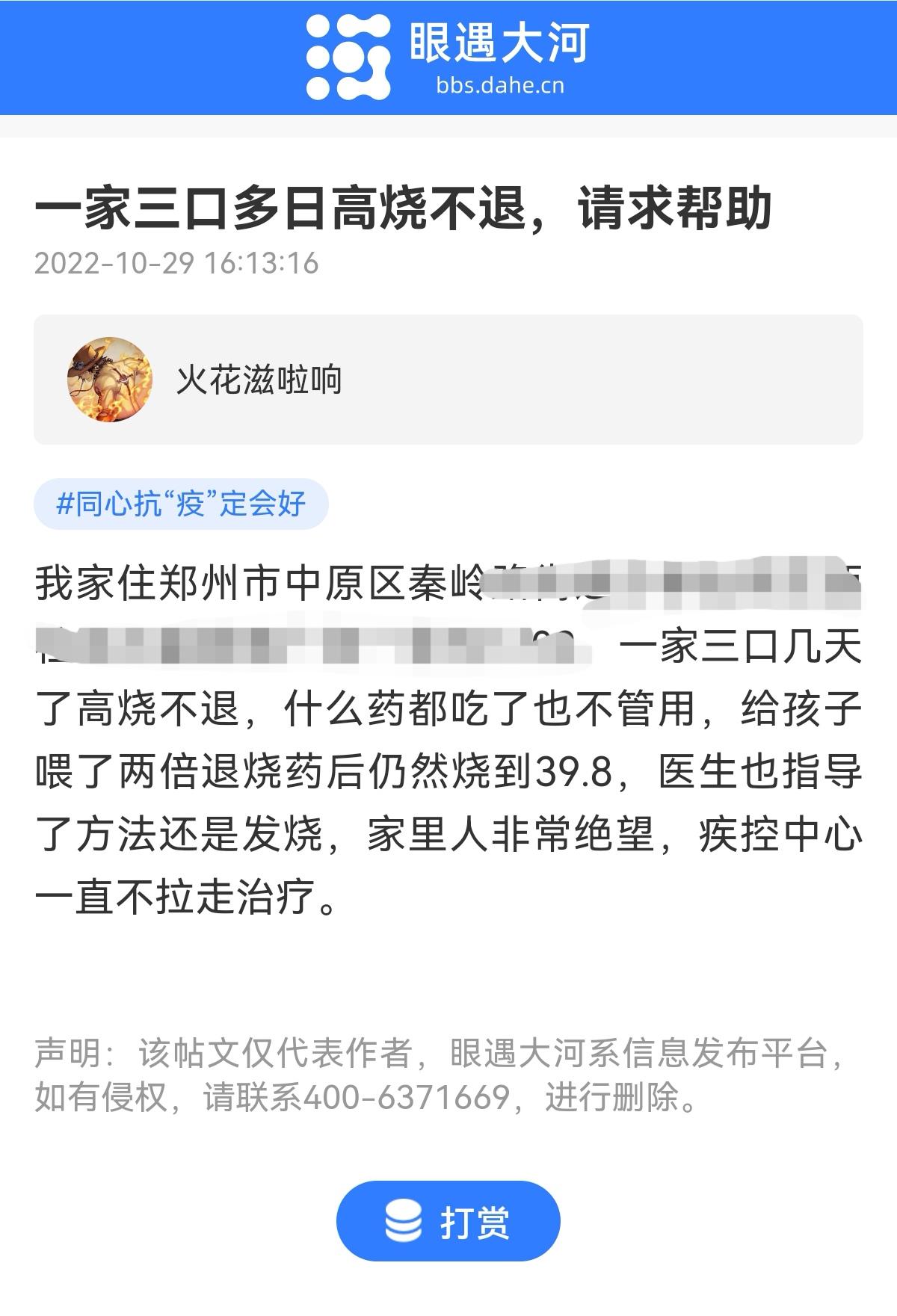 大河网讯(记者 祝传鹏) 一家三口几天了高烧不退,什么药都吃了也不管用,怎么办?10月29日,居住在郑州市中原区的网友胡先生通过“眼遇大河”平台留言,反映了自己的烦恼。