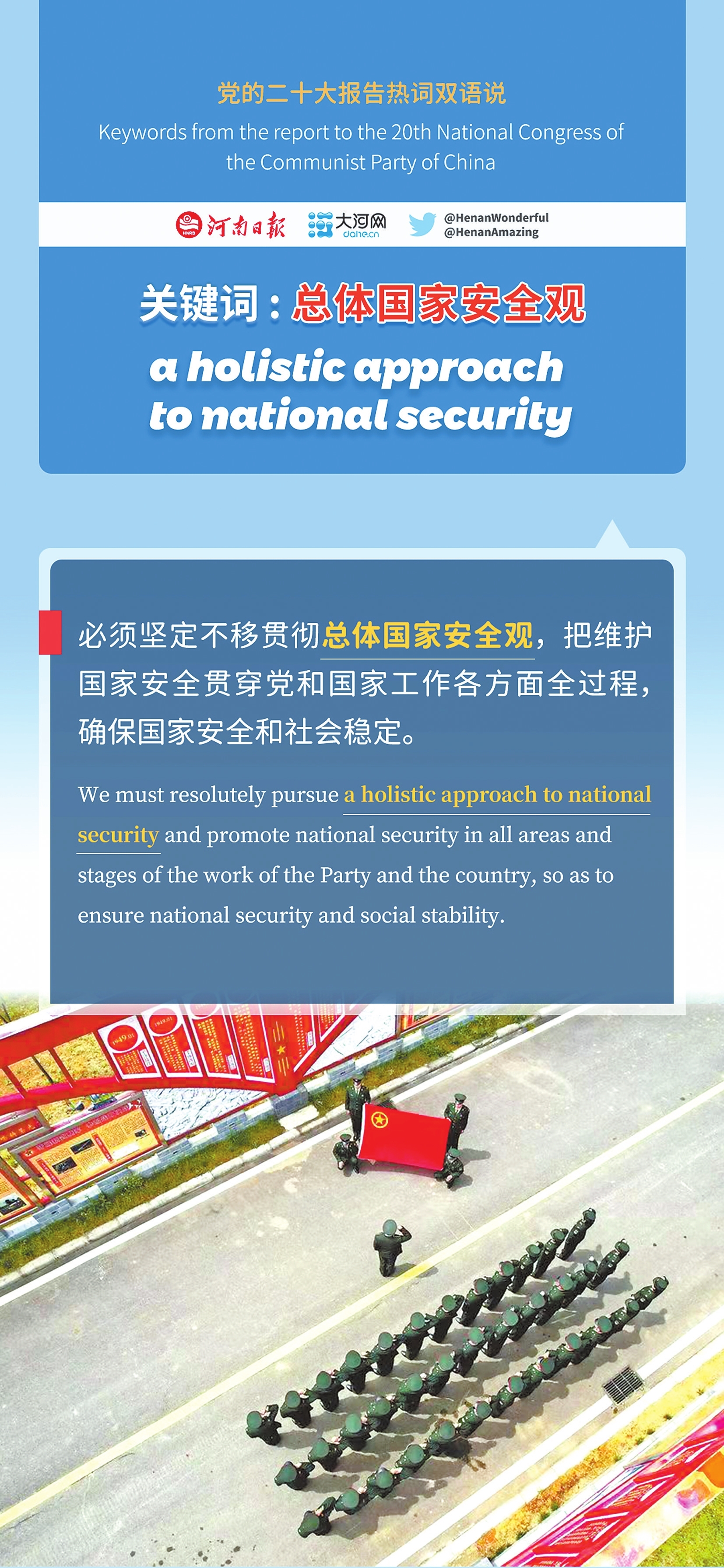 这300多个新提法中,有很多已成为备受瞩目的热词,今日推出“党的二十大报告热词双语说”系列海报第十二篇“总体国家安全观”,和您一起品读报告热词,解析中国方案,感受中国力量,分享中国故事。