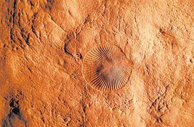 南澳大利亚尼佩纳·埃迪卡拉国家公园砂岩中的埃迪卡拉纪化石狄更逊水母(中)与较小的锚形帕文柯利纳虫(左)的图像。图片来源:斯科特·埃文斯