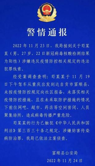 11月24日,自贡市富顺县公安局发布警情通报:11月23日,该局接到关于芶某某(男,27岁,22日新冠病毒核酸检测结果为阳性)涉嫌违反疫情防控相关规定的违法犯罪线索。经受案调查查明:芶某某于11月19日下午驾车从重庆出发到达自贡市富顺县,未按疫情防控规定向社区报备,未落实相关疫情防控措施,且在未采取防护措施的情况下前往网吧、超市、药店等空间密闭、人员聚集场所,造成病毒传播严重危险。芶某某的行为已触犯《中华人民共和国刑法》第三百三十条之规定,涉嫌妨害传染病防治罪,富顺警方已依法立案侦查。