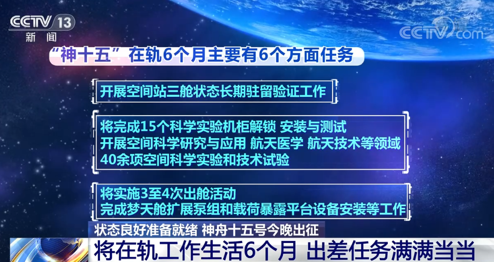在轨6个月,“神十五”乘组都有哪些任务呢?主要有6个方面:首先,开展空间站三舱状态长期驻留验证工作;接下来,将完成15个科学实验机柜解锁、安装与测试,开展空间科学研究与应用、航天医学、航天技术等领域的40余项空间科学实验和技术试验;第三,将实施3至4次出舱活动,完成梦天舱扩展泵组和载荷暴露平台设备安装等工作;第四个任务,验证货物气闸舱出舱工作模式,与地面协同完成6次货物出舱任务;接下来,就是开展常态化的平台测试、维护及站务管理工作;最后一个任务,是开展在轨健康防护锻炼、在轨训练与演练等工作。