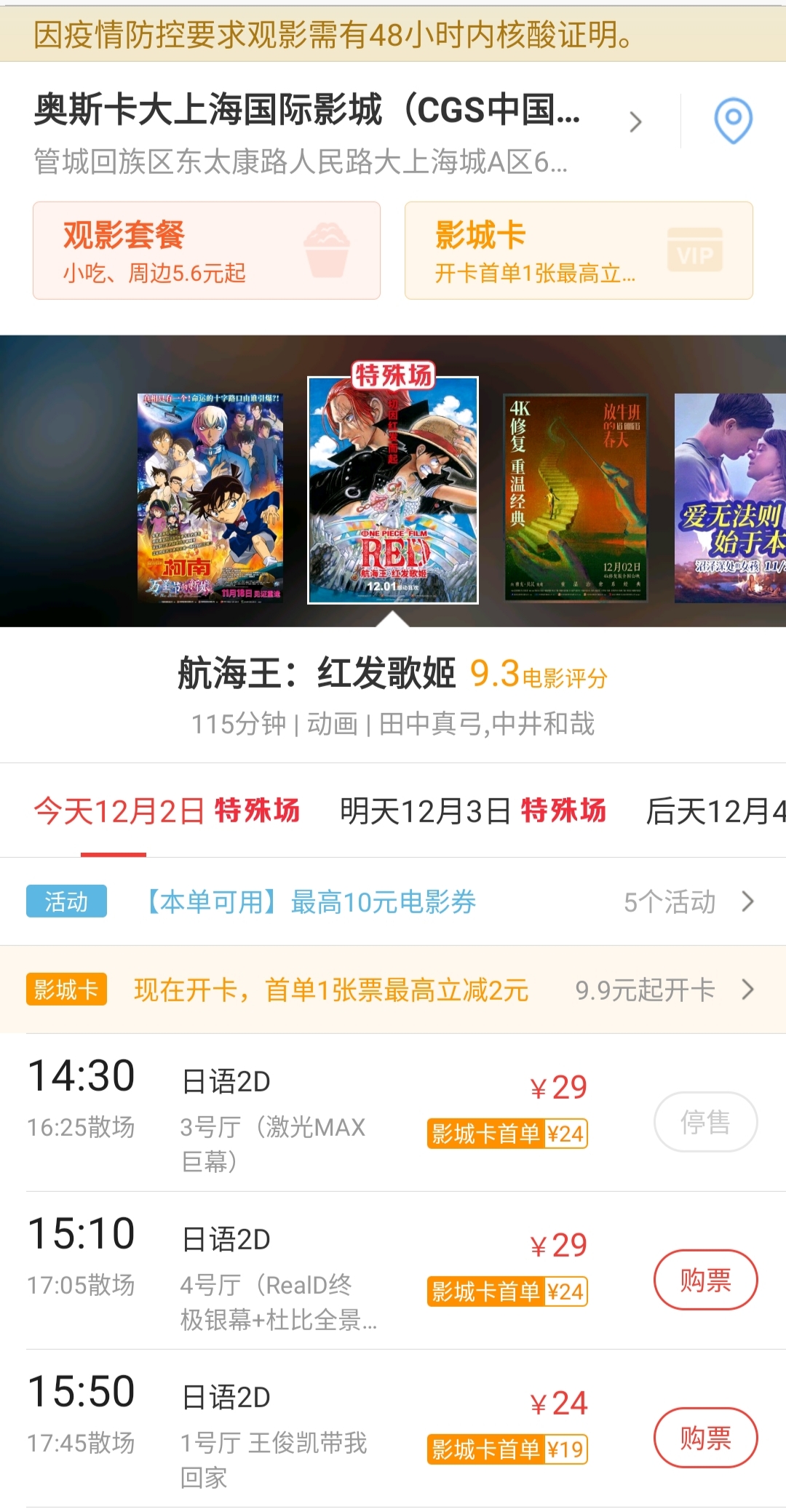 影院复工后,目前排片以《航海王》和《柯南》两部进口动画片为主,后期即将上映的《阿凡达2》也在准备预售中。