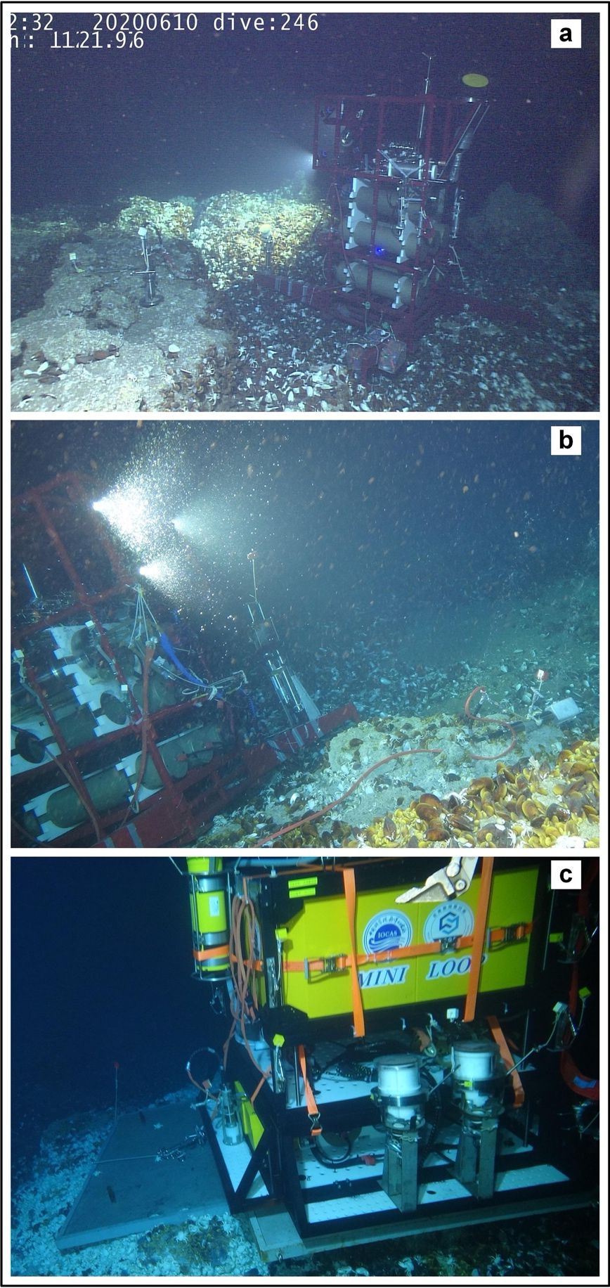 △Mulit-RiPs搭载LOOP连续三年(a:2020年;b:2021年;c:2022年)布放于我国南海北部冷泉区域开展深海原位长期观测与现场实验