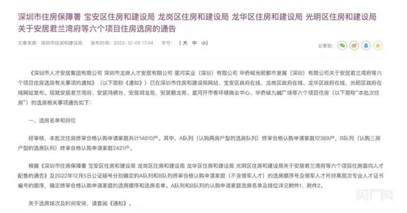 人才配售房选房通告(央广网发 深圳市住房和建设局供图)