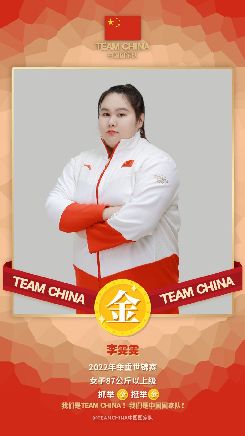 2022年举重世锦赛在哥伦比亚波哥大继续进行,中国队出战本届世锦赛最后一个项目,东京奥运冠军李雯雯发挥出色,包揽女子87公斤以上级三枚金牌,总成绩比亚军得主高出24公斤。