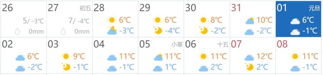 元旦假期全省天气以晴天到多云为主。受频繁冷空气活动影响,我省大部地区气温较常年同期偏低,公众还需根据天气变化合理安排着装,做好防寒保暖工作,也需密切留意预报预警,外出注意防范雨雪天气带来的各种不利影响。(天气预测仅供参考,最终以河南气象发布为准)。