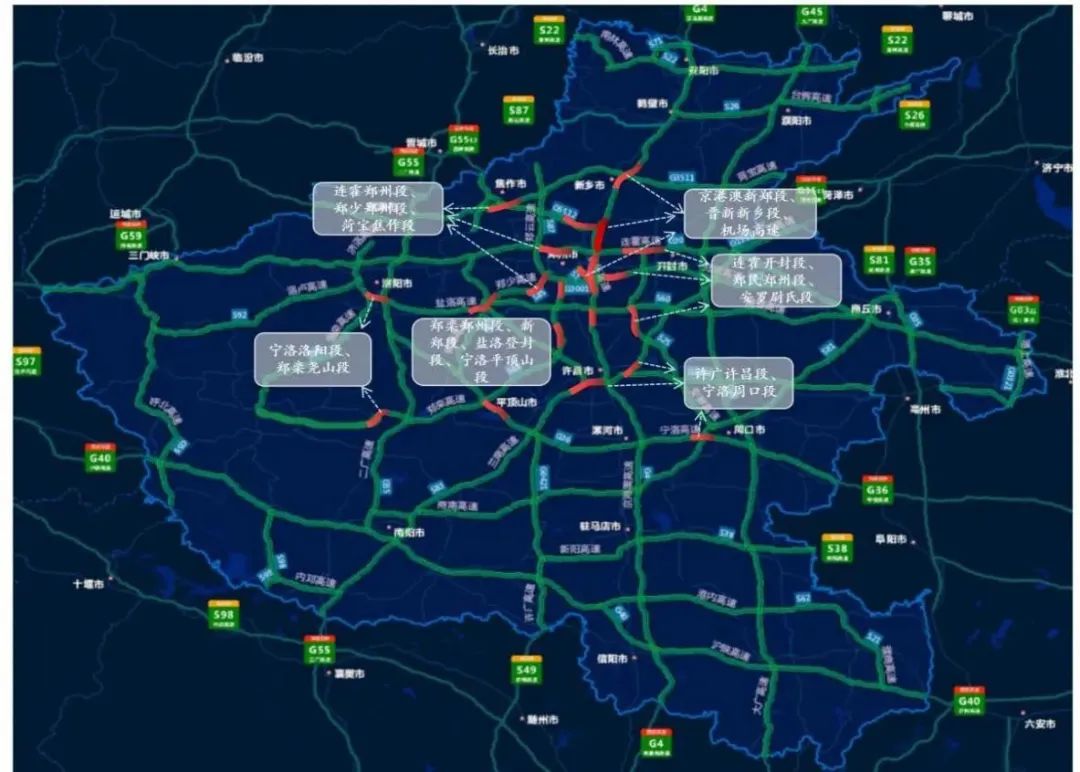 元旦期间,以郑州为中心向外辐射的短途出行车流占全省比重较大,预计全省易堵路段分布情况如下: