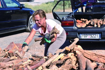 10月20日,在希腊首都雅典南郊的格利法达,一名女子拾取免费木柴。新华社发