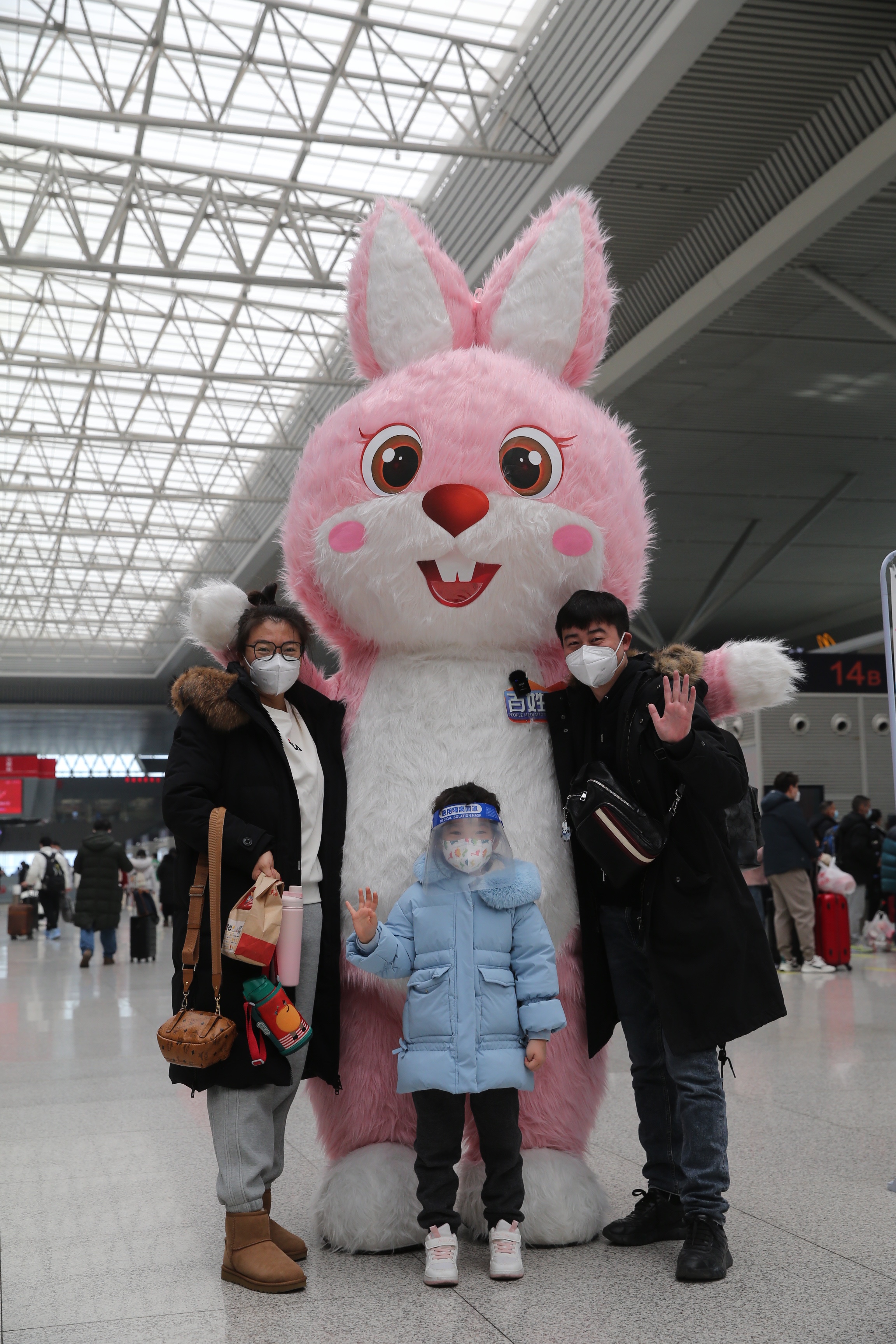 杨磊全家在兔子玩偶前合影留念。他说,孩子几年前一直心心念的迪士尼乐园,这个春节可以安排上了。