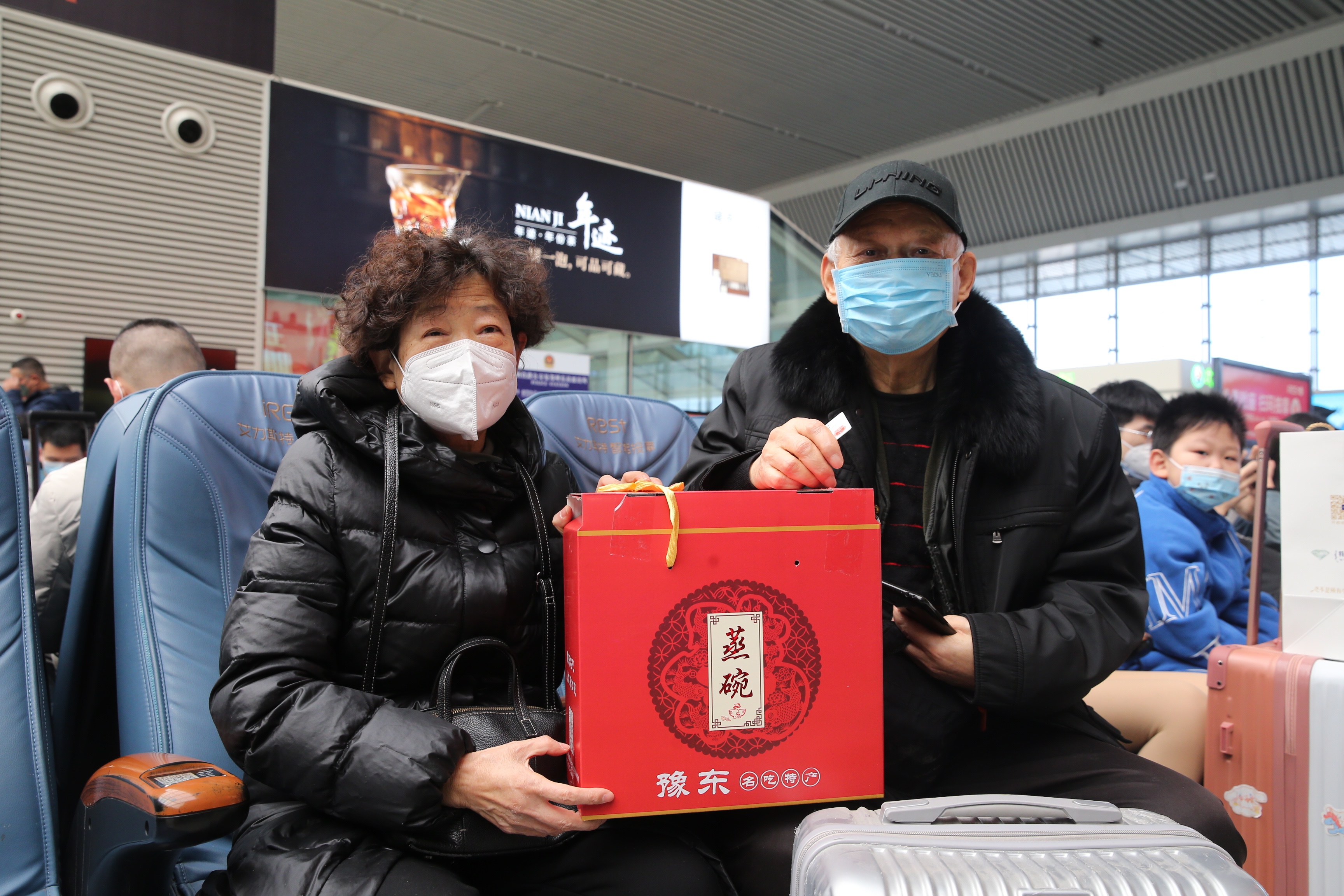 乘车回南阳的张一鸣夫妇说,他们已经有半年多没有回家了,就想着赶快回家。老两口带着孙子、孙女最爱吃的特色美食作为新春礼物。