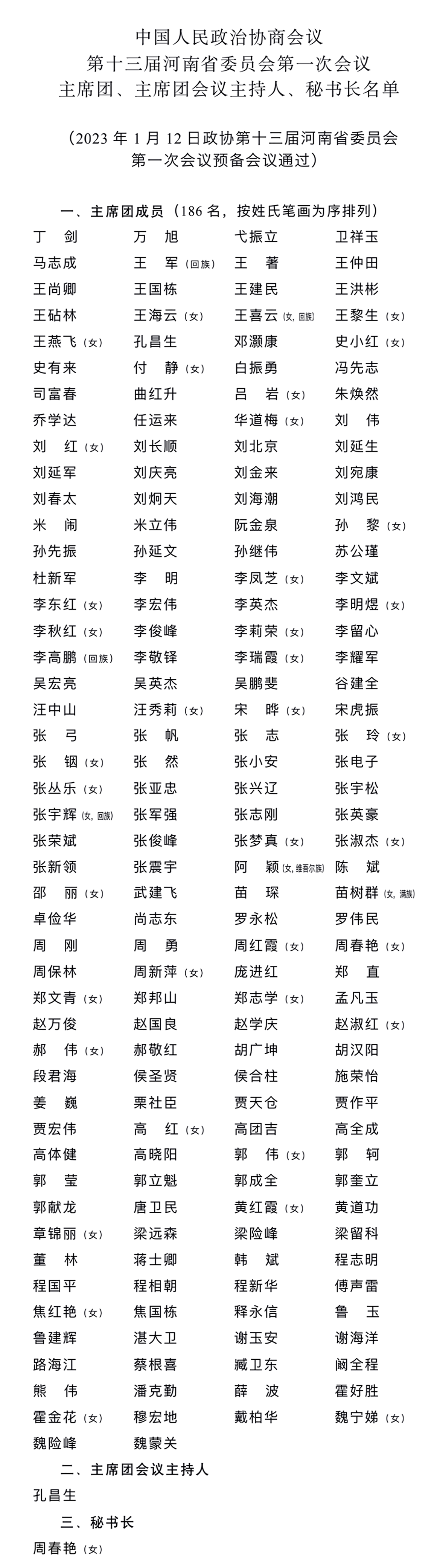 会议首先审议通过了省政协十三届一次会议主席团、主席团会议主持人、秘书长名单,孔昌生为主席团会议主持人,周春艳为大会秘书长。