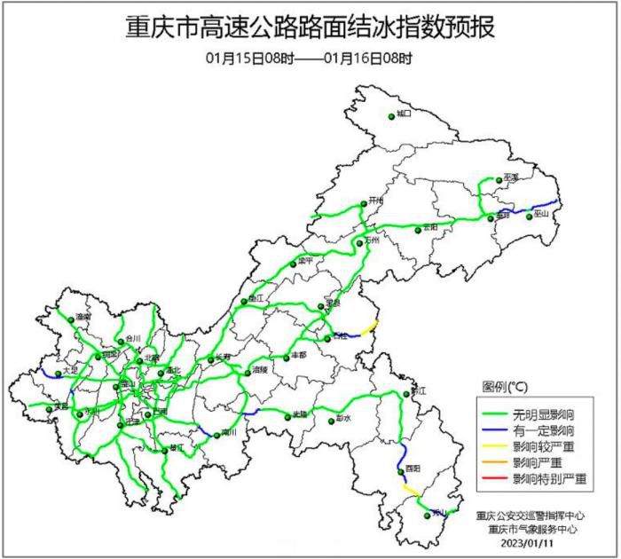 此外,预计受道路结冰影响明显的高速路段有: G65包茂高速:大观—白马段、酉阳—雅江段; G50沪渝高速:冷水—石柱段; G42沪蓉高速:巫山—草堂段; G5013渝蓉高速:大足—安岳段。