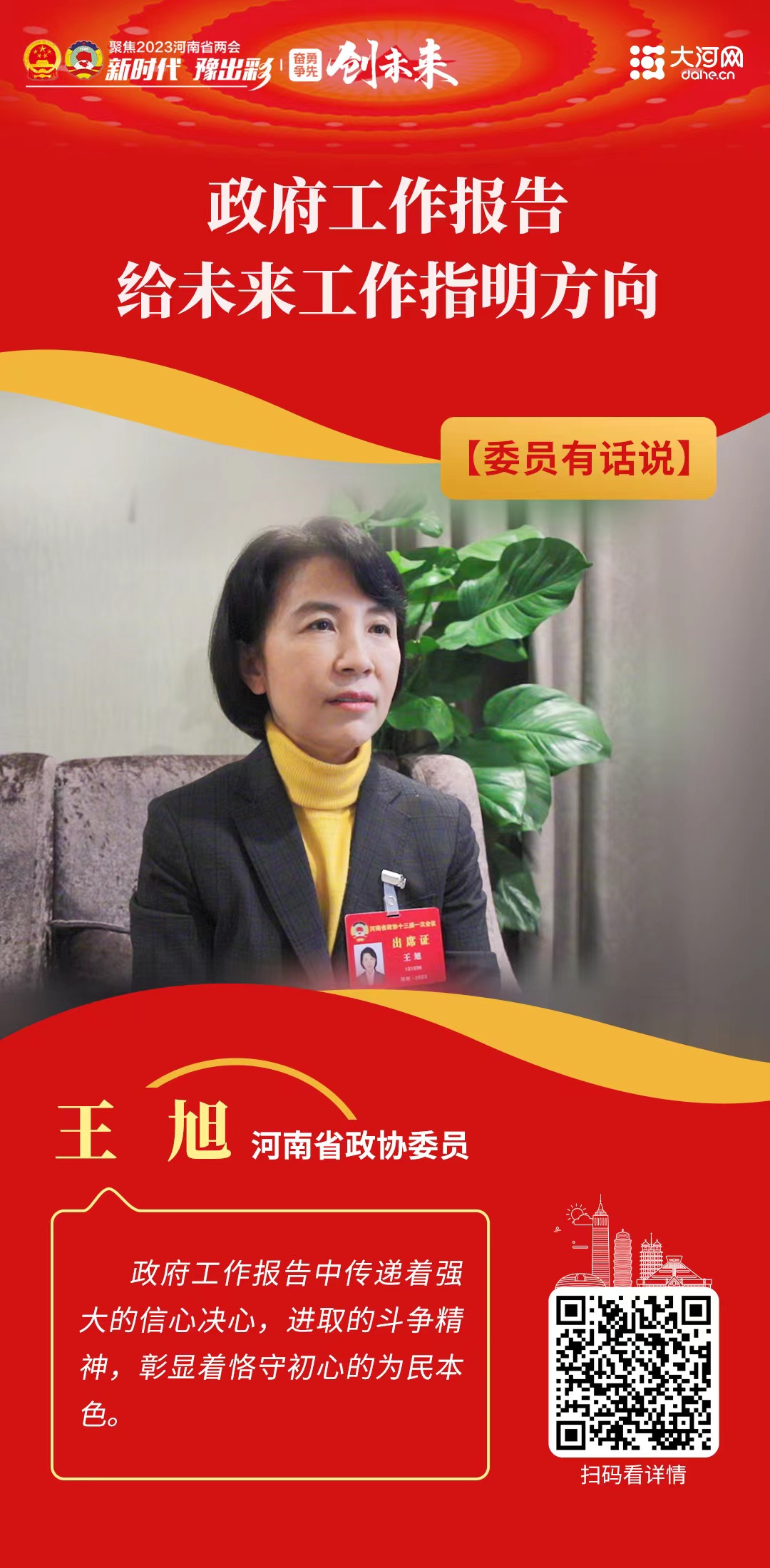 王旭说,在听取政府工作报告时,她的感受可以用三个关键词概括。第一个关键词是“看齐”。“让我们紧密团结在以习近平同志为核心的党中央周围,在省委坚强领导下,勠力同心、勇毅前行,加快现代化河南建设,奋力谱写新时代更加出彩的绚丽篇章”的号召给她留下了深刻的印象。王旭说,这句话充分彰显了省委对标党中央、看齐总书记的核心意识,彰显了高度的政治站位、坚定践行“两个维护”的政治立场,彰显了贯彻落实习近平总书记重要讲话重要指示精神的行动自觉。