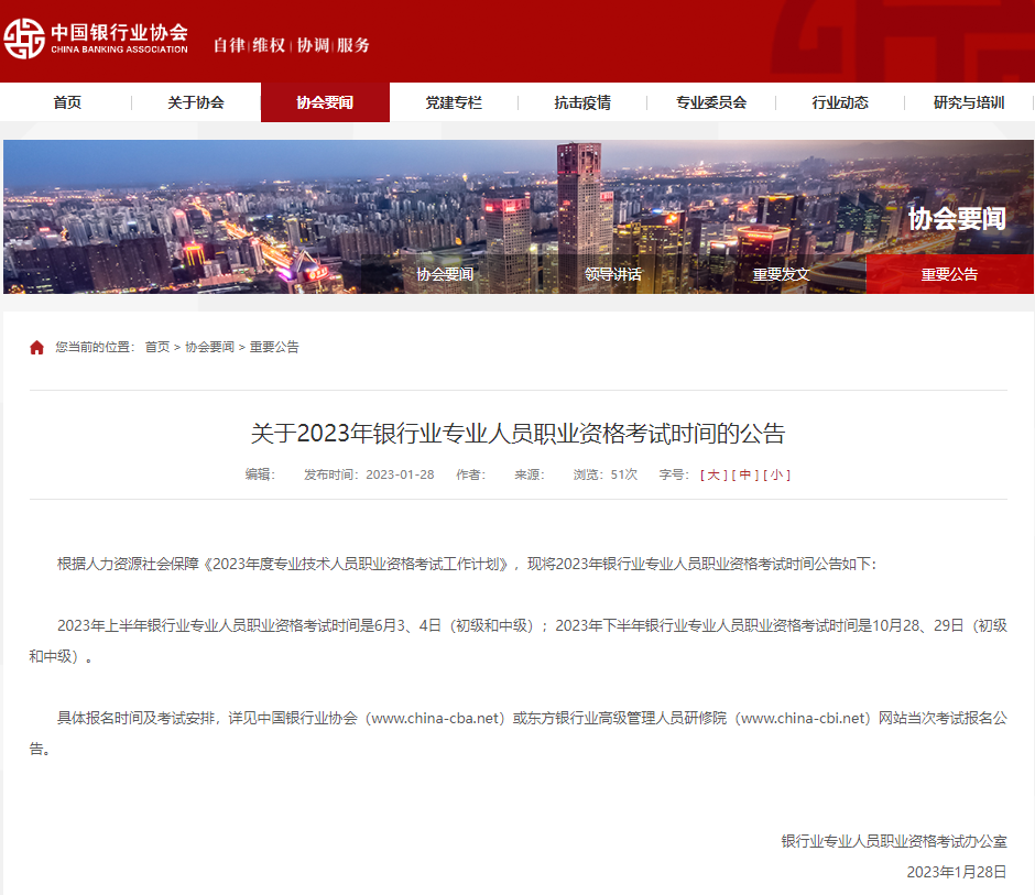 【大河财立方消息】1月28日,银行业专业人员职业资格考试办公室公告,2023年上半年银行业专业人员职业资格考试时间是6月3、4日(初级和中级);2023年下半年银行业专业人员职业资格考试时间是10月28、29日(初级和中级)。