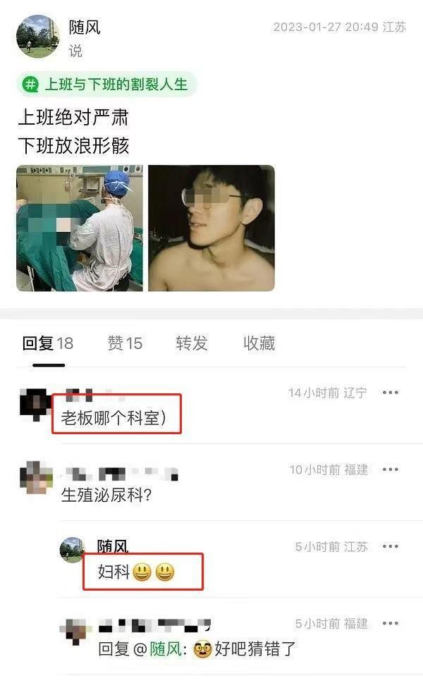 令默默震惊的是,网友“随风”的工作照是在医院环境,且有一位患者就诊的照片,“照片没有打码,可以清楚看到女性下体,不知道是在手术还是就诊。”默默表示,自己在看到后第一时间已截图留存。根据默默提供的截图显示,有网友在留言中询问“随风”是否为生殖泌尿科医生,“随风”回应称“妇科”。