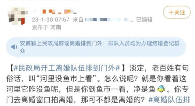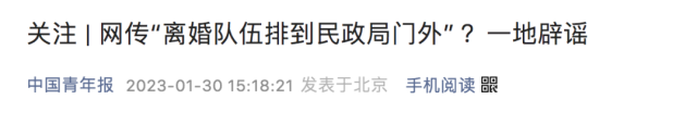 1月30日,安徽颍上县民政局曾发布辟谣声明:2023年1月28日,网上流传“安徽阜阳一男子拍到民政局仅有两对新人结婚,离婚队伍排到民政局门外”相关信息。经核实,此信息为谣言。