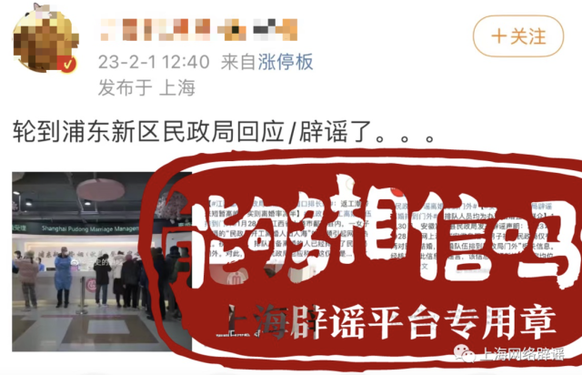其中,有自媒体发布一张“上海浦东新区民政局离婚窗口”存在排队情况的图片,并配文“轮到浦东新区民政局回应/辟谣了......”。
