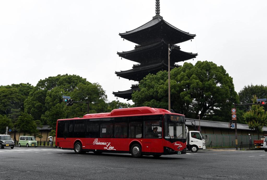 2018年6月20日,比亚迪电动巴士行驶在日本京都东寺大街。(新华社记者马平摄)