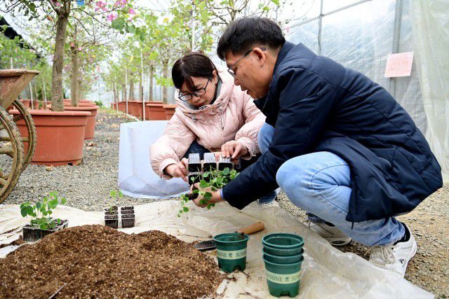 科研人员将洋紫荆幼苗从培养箱移植至大盆。