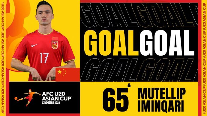 第65分钟,被动的U20国足率先打破僵局,艾菲尔丁左路突破传中,替补登场的木塔力甫抢点推射破门。中国队1:0领先。