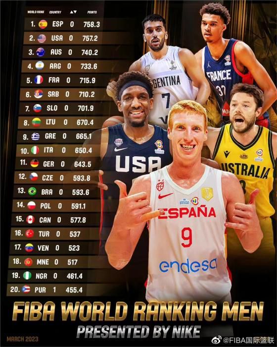 中新网3月8日电 日前,国际篮联公布了最新一期男子世界排名,中国男篮排名第27位,西班牙男篮依旧力压美国男篮占据榜首,中国男篮的老对手伊朗男篮下降两位,排在第22位。(完)