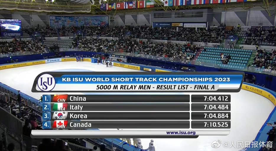 刚刚结束的2023短道速滑世锦赛男子5000米接力决赛中,李文龙、林孝埈、刘冠逸和钟宇晨组成的中国队以7分04秒412的成绩夺得冠军!为中国队收获了本届比赛的第一枚金牌!