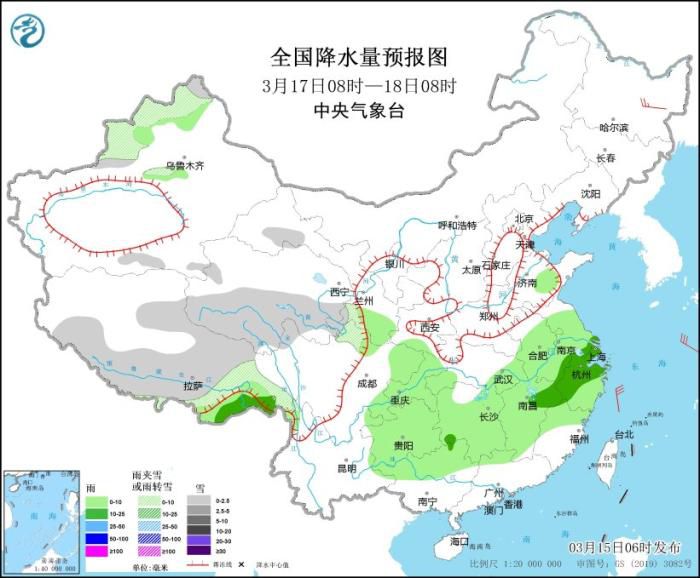 3月17日08时至18日08时,西藏中东部、青海南部等地部分地区有小雪或雨夹雪。西藏东南部、江淮大部、江汉东部、江南大部、西南地区东部、华南北部等地部分地区有小雨,部分地区有中雨。黑龙江东北部部分地区有4~5级风。