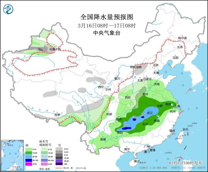 3月16日08时至17日08时,新疆沿天山地区、西藏东部、山西北部、川西高原北部等地部分地区有小到中雪。黄淮西部、江淮西部和南部、江汉大部、江南北部和西部、西南地区东南部等地部分地区有中到大雨,其中,湖南北部和西部、贵州中东部等地部分地区有暴雨(50~70毫米),并伴有短时雷暴大风、冰雹等强对流天气。
