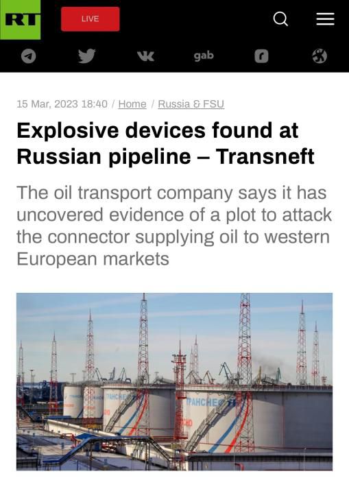 中新网3月16日电 据“今日俄罗斯”(RT)15日报道,俄罗斯国家石油管道运输公司(Transneft)发言人伊戈尔·德明 (Igor Demin) 称,该公司工人在靠近乌克兰的俄边境地区布良斯克州“友谊”输油管道(Druzhba)线上的新济布科夫石油泵站,发现数个爆炸装置碎片。