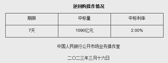 中新网3月16日电 据央行网站16日消息,为维护银行体系流动性合理充裕,2023年3月16日人民银行以利率招标方式开展了1090亿元逆回购操作,期限为7天,中标利率为2.00%。(中新财经)