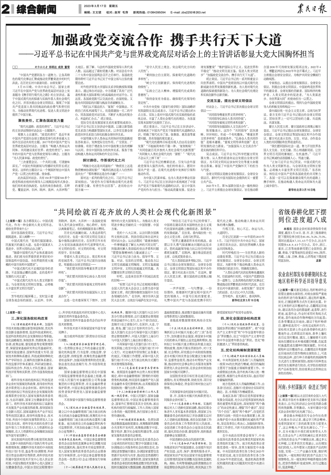 “党的十八大以来,习近平总书记始终与我们老百姓想在一起、干在一起,打赢了反腐败、深化改革、脱贫攻坚、抗击疫情等大仗、硬仗、漂亮仗,为我们的美好生活创造了一个又一个光明前景。”刚从北京回来的全国人大代表、辉县市张村乡裴寨村党支部书记裴春亮表示,总书记的讲话让全村党员群众感到欢欣鼓舞,非常激动。大家对建设中国式农业农村现代化充满了信心。