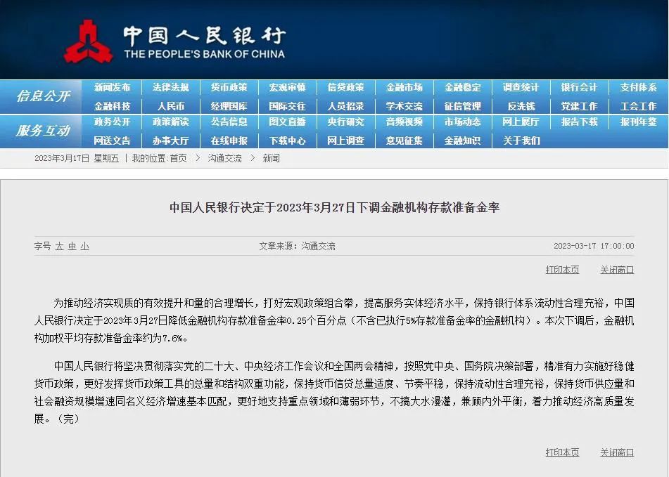 中国人民银行决定于2023年3月27日下调金融机构存款准备金率