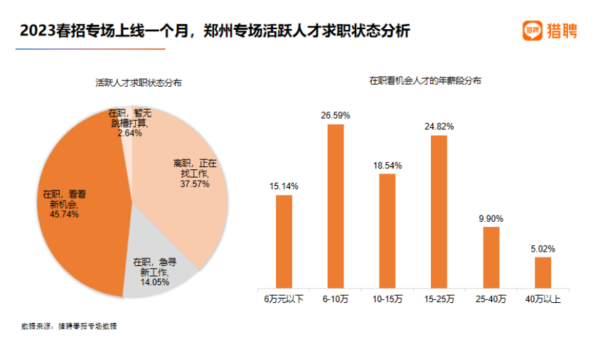 活跃求职者中,在职看机会人才占比最高为45.74%,其次为离职正在找工作人才占比37.57%。从年薪区间分布看,年薪在6万元至10万元的占比最高,为26.59%;年薪在15万元至25万元的以24.82%的占比位居第二。年薪在25万元至40万元和40万元以上的占比相对最少。整体来看,薪资中等的人才在职看机会的意愿较高薪人才更高,高薪人才心态相对趋稳、保守。
