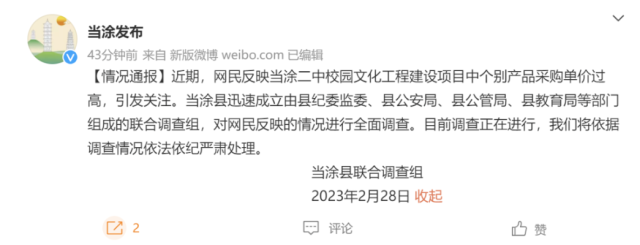 据@当涂发布,2月28日,当涂县联合调查组发布情况通报,近期,网民反映当涂二中校园文化工程建设项目中个别产品采购单价过高,引发关注。当涂县迅速成立由县纪委监委、县公安局、县公管局、县教育局等部门组成的联合调查组,对网民反映的情况进行全面调查。目前调查正在进行,我们将依据调查情况依法依纪严肃处理。